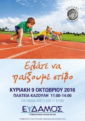 Η ΑΚΑΔΗΜΙΑ ΣΤΙΒΟΥ του συλλόγου μας, γιορτάζοντας την ΄΄ΕΥΡΩΠΑΪΚΗ  ΕΒΔΟΜΑΔΑ ΑΘΛΗΤΙΣΜΟΥ¨ σε συνεργασία με τον Δ.Ο.ΠΑ.Β.Σ, σας προσκαλεί να λάβετε μέρος στην εκδήλωση :KIDS ATHLETICS: για παιδιά από 05 έως 11 ετών, που θα γίνει την ΚΥΡΙΑΚΗ 09 Οκτωβρίου από  ώρα 11,00μ.μ. έως και 14,00 μ.μ.  στην ΠΛΑΤΕΙΑ ΚΑΖΟΥΛΗ(ΜΟΥΣΕΙΟ).