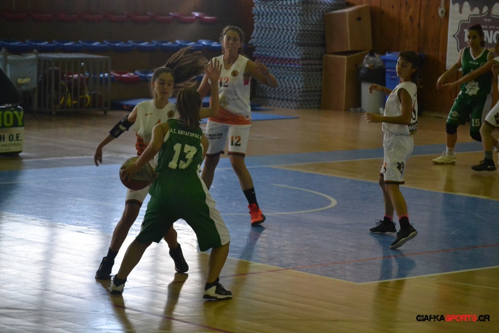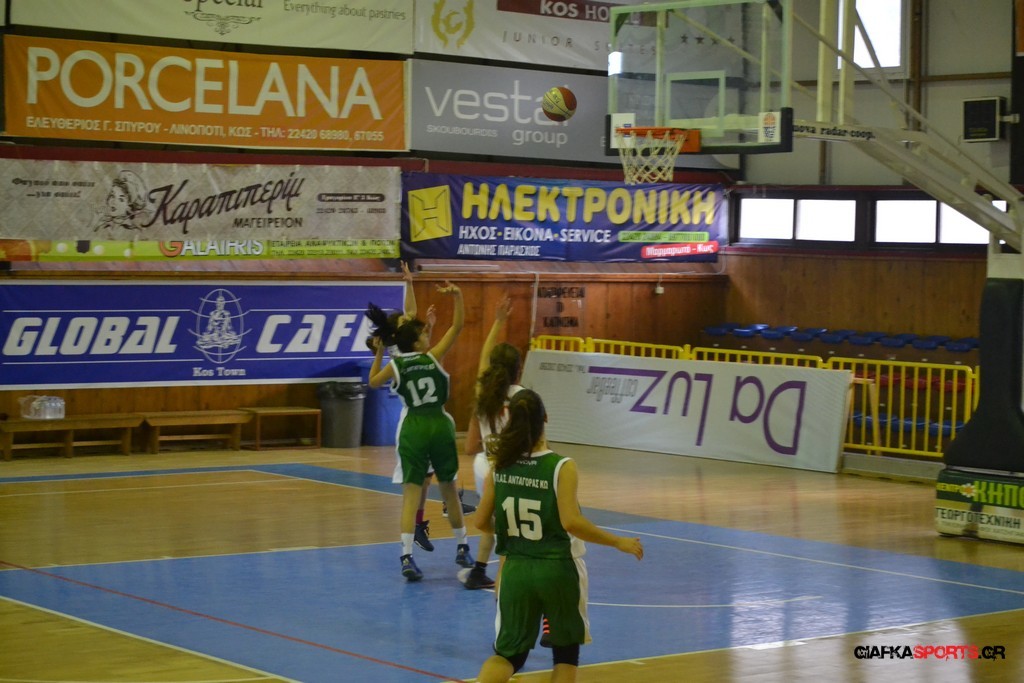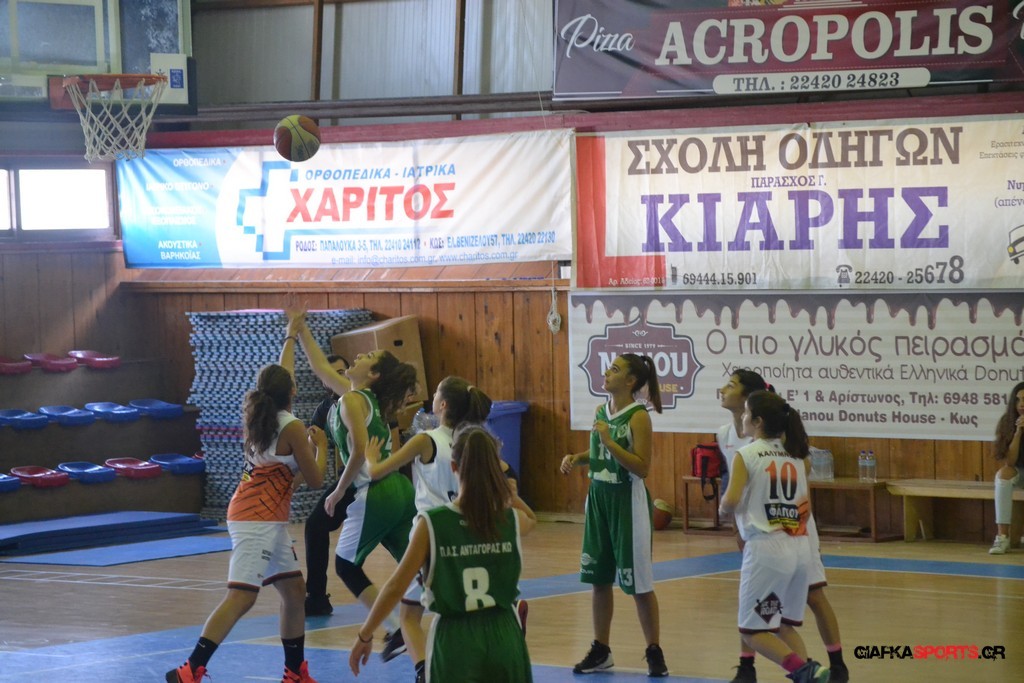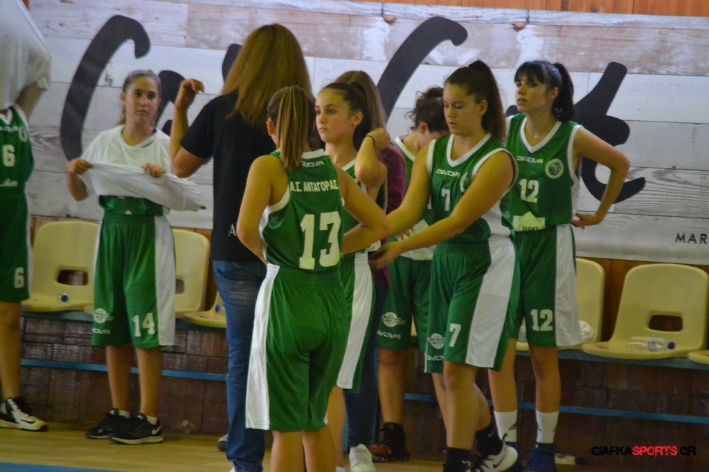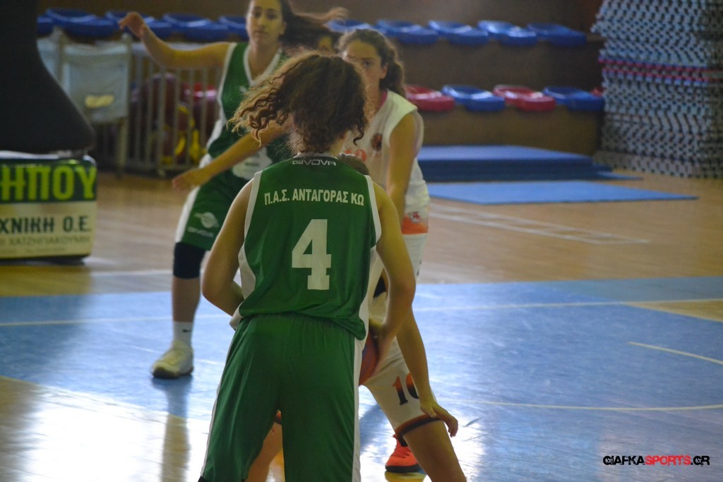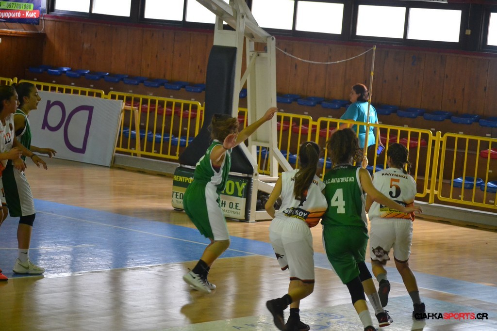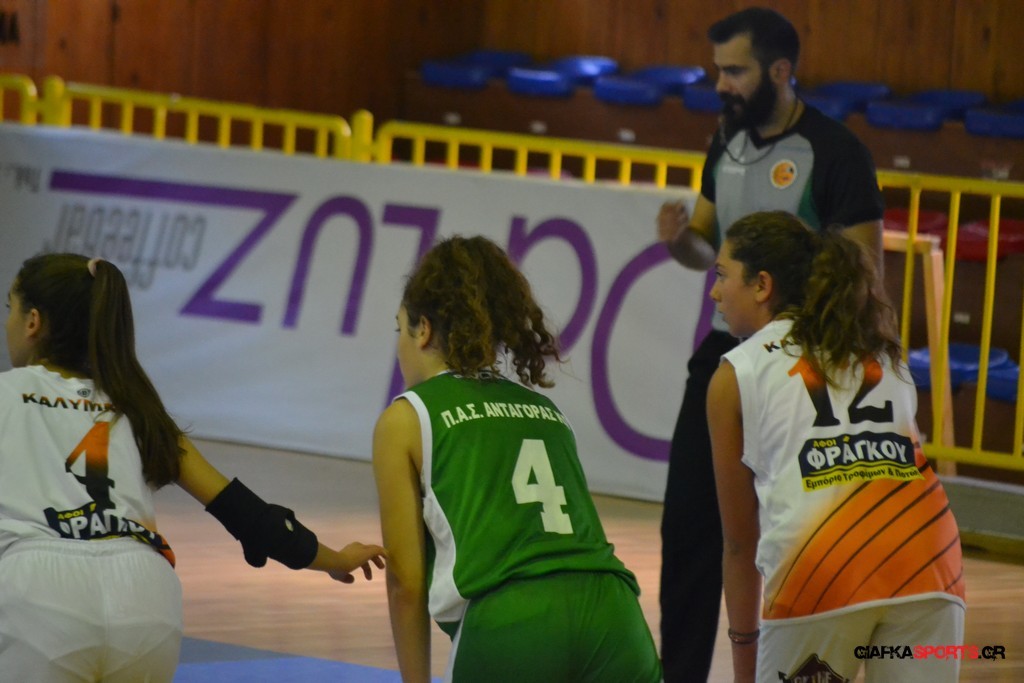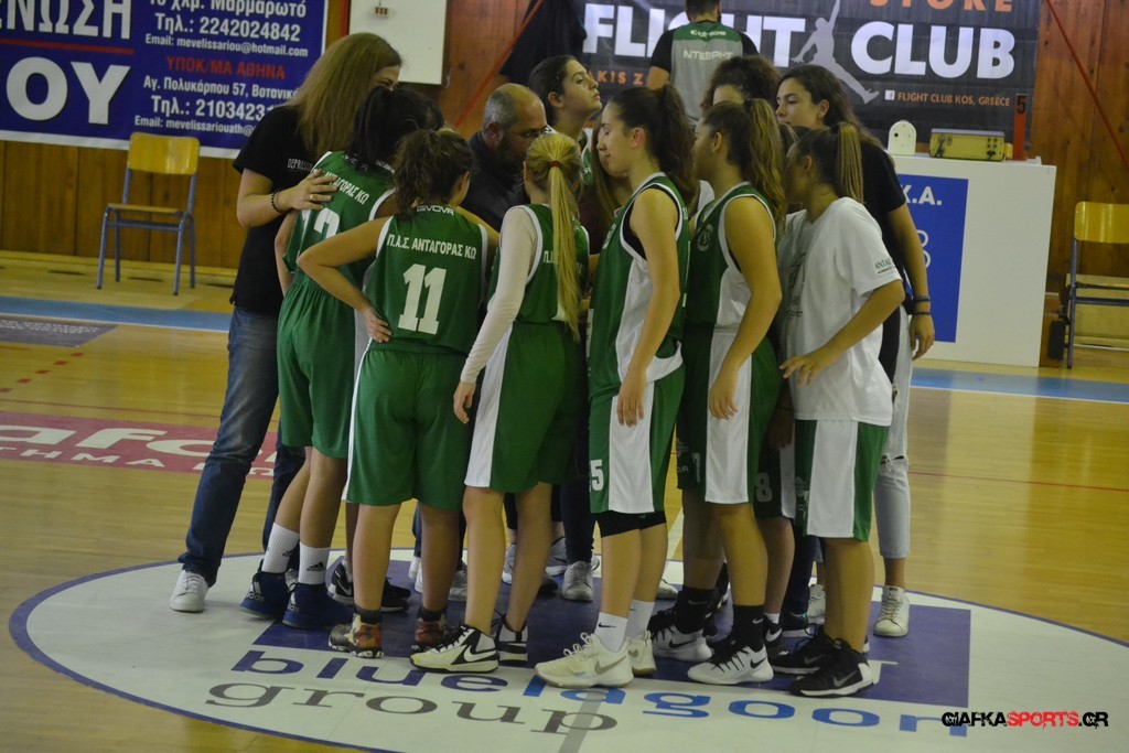 Έχοντας σε καταπληκτική μέρα τις Κουζούκα και Χατζηνικολάου που πέτυχαν συνολικά 45 πόντους ο Ανταγόρας επικράτησε με 54-40 της Ακαδημίας Καλύμνου πετυχαίνοντας έτσι την 2η του νίκη στο φετινή πρωτάθλημα. Οι “πράσινες” κατάφεραν να πάρουν προβάδισμα απ’ το πρώτο δεκάλεπτο και να “χτίσουν” στην συνέχεια πάνω σε αυτό και έφτασαν στο ροζ φύλλο αγώνος. Για την ομάδα του κ. Καλαϊτζίδη ξεχώρισαν οι Κουφάκη και Μεϊμάρη.