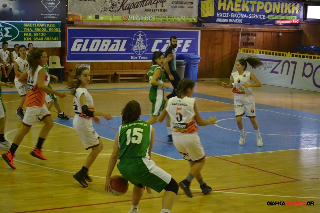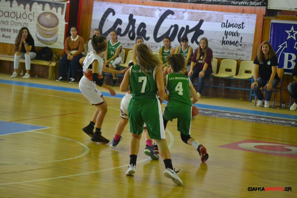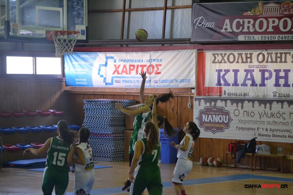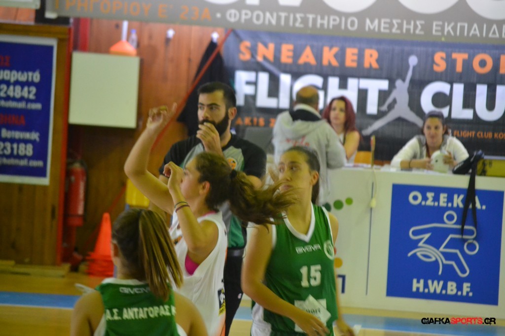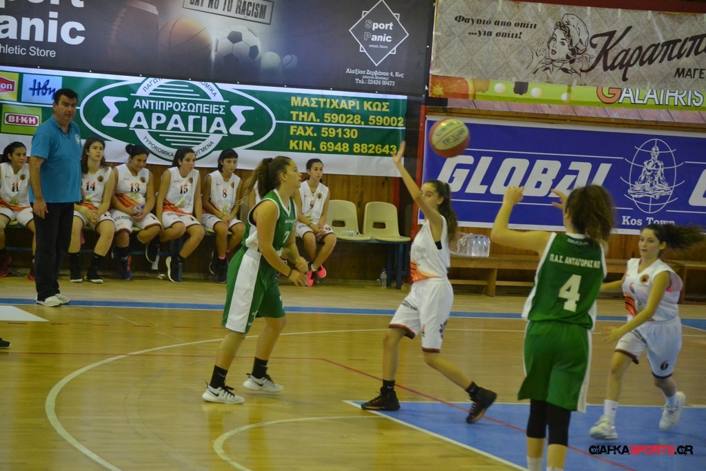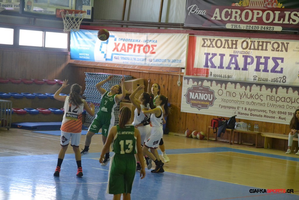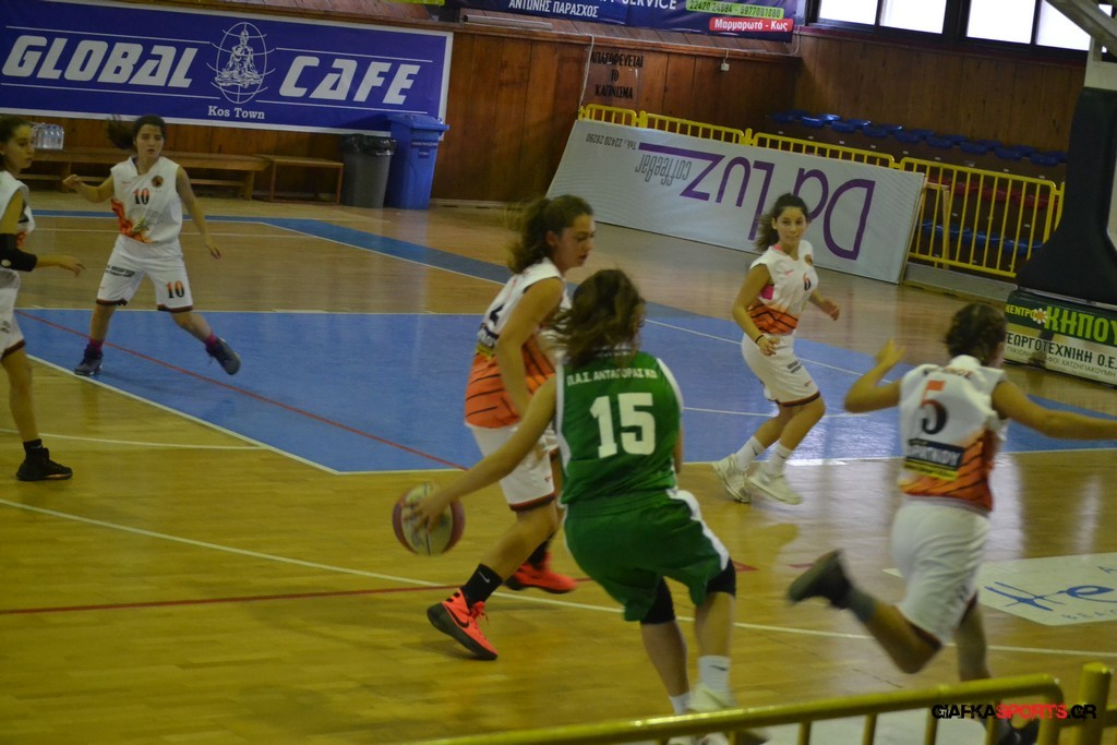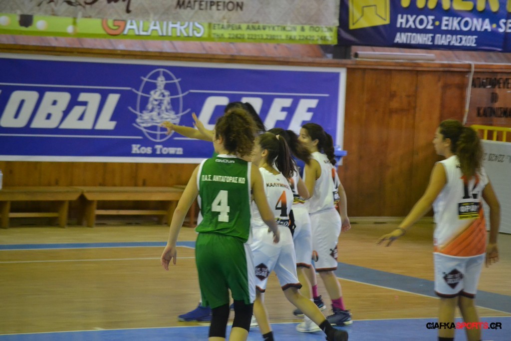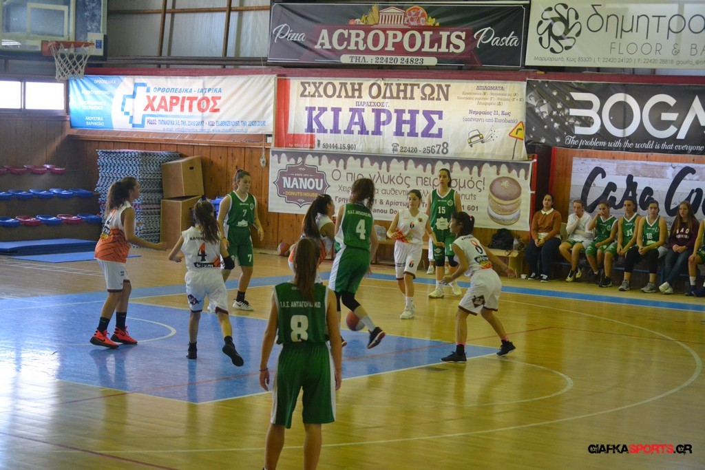 Έχοντας σε καταπληκτική μέρα τις Κουζούκα και Χατζηνικολάου που πέτυχαν συνολικά 45 πόντους ο Ανταγόρας επικράτησε με 54-40 της Ακαδημίας Καλύμνου πετυχαίνοντας έτσι την 2η του νίκη στο φετινή πρωτάθλημα. Οι “πράσινες” κατάφεραν να πάρουν προβάδισμα απ’ το πρώτο δεκάλεπτο και να “χτίσουν” στην συνέχεια πάνω σε αυτό και έφτασαν στο ροζ φύλλο αγώνος. Για την ομάδα του κ. Καλαϊτζίδη ξεχώρισαν οι Κουφάκη και Μεϊμάρη.