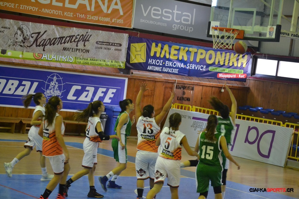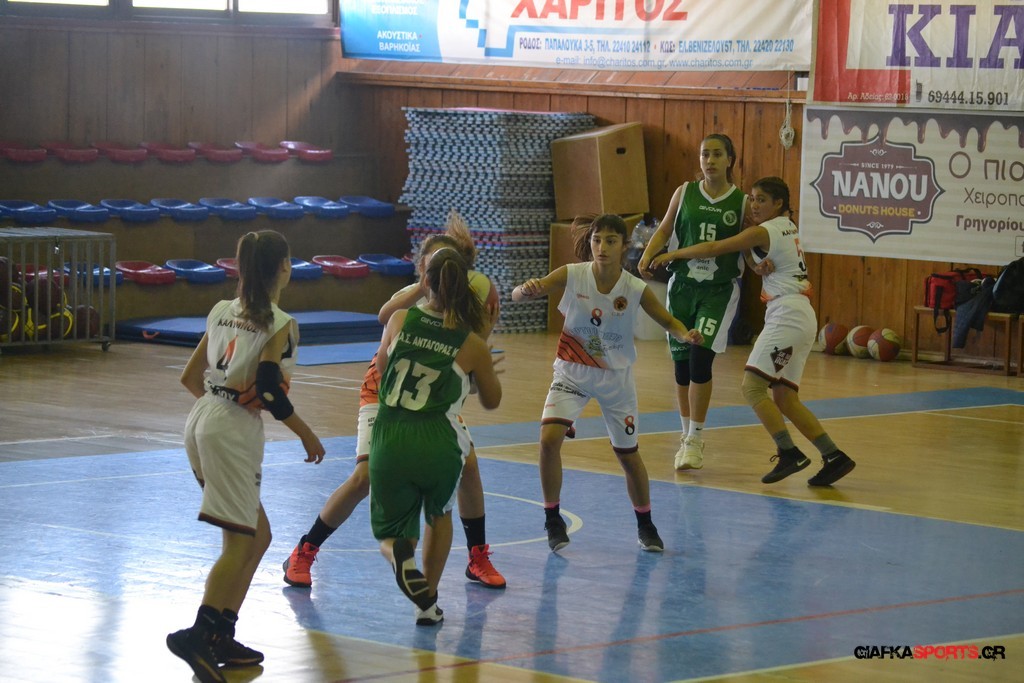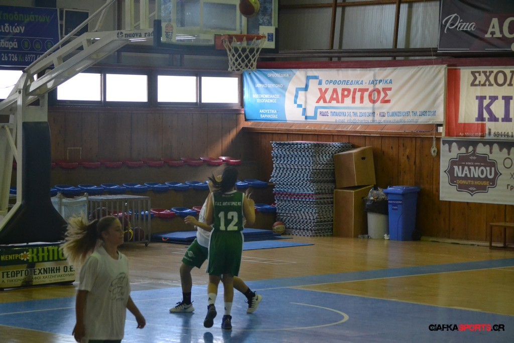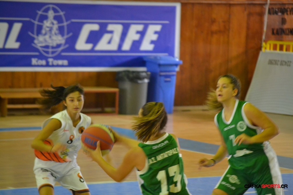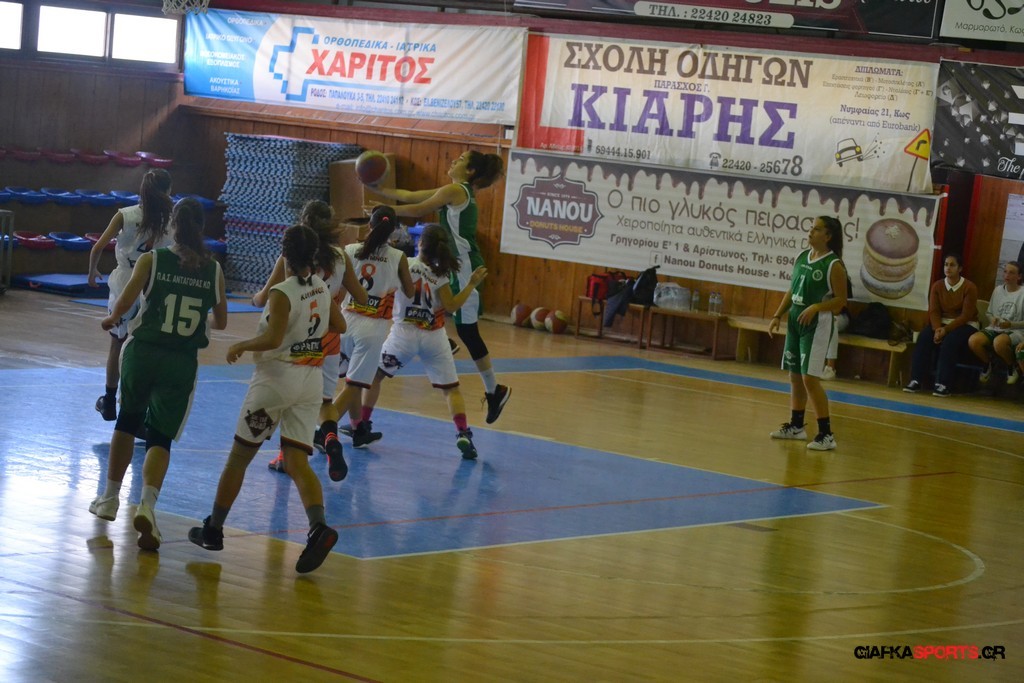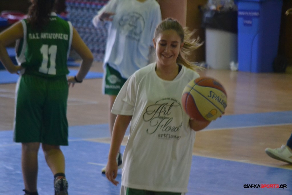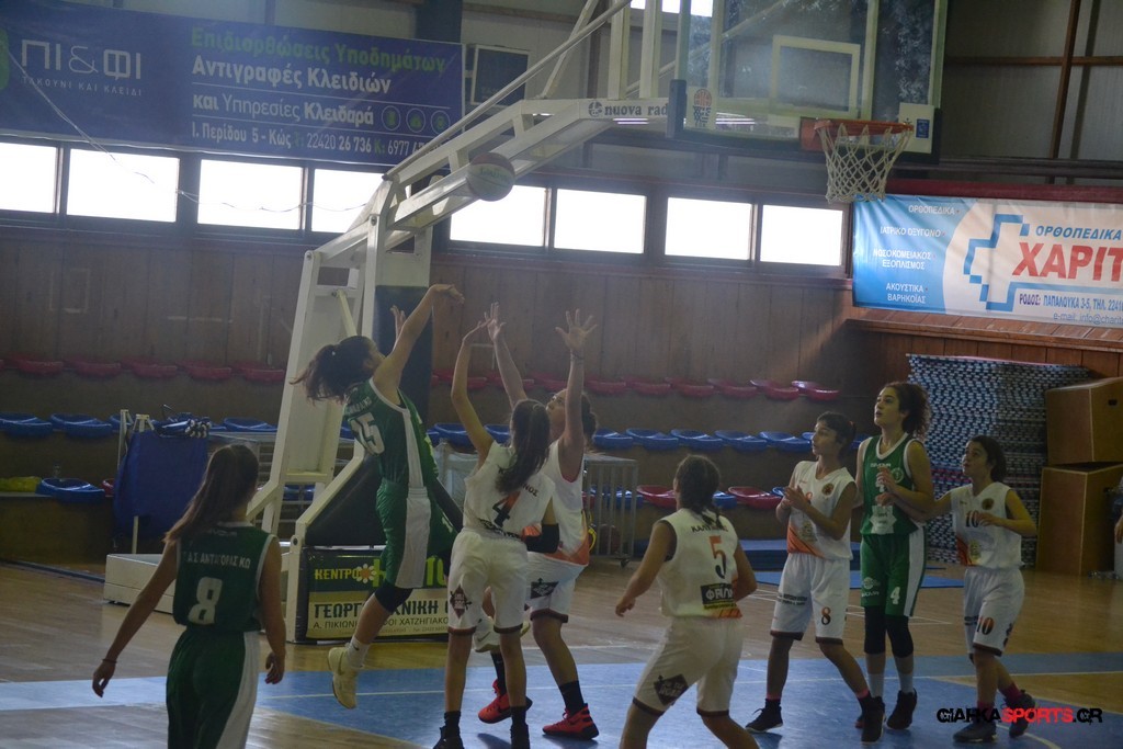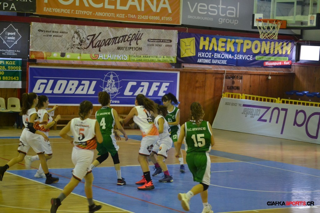 Έχοντας σε καταπληκτική μέρα τις Κουζούκα και Χατζηνικολάου που πέτυχαν συνολικά 45 πόντους ο Ανταγόρας επικράτησε με 54-40 της Ακαδημίας Καλύμνου πετυχαίνοντας έτσι την 2η του νίκη στο φετινή πρωτάθλημα. Οι “πράσινες” κατάφεραν να πάρουν προβάδισμα απ’ το πρώτο δεκάλεπτο και να “χτίσουν” στην συνέχεια πάνω σε αυτό και έφτασαν στο ροζ φύλλο αγώνος. Για την ομάδα του κ. Καλαϊτζίδη ξεχώρισαν οι Κουφάκη και Μεϊμάρη.
