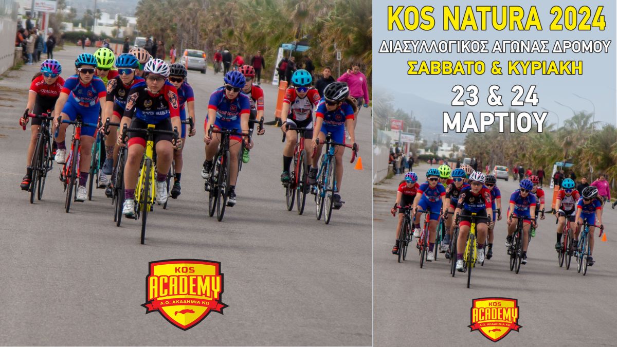 Ο Αθλητικός Όμιλος Ακαδημία Κω, το Σάββατο 23 και την Κυριακή 24 Μαρτίου, διοργανώνει διασυλλογικό αγώνα ποδηλασίας δρόμου με την επωνυμία «KOS NATURA – 2024», στα αγωνίσματα της ατομικής χρονομέτρησης και Criterium αντίστοιχα, στην περιοχή της Λάμπης (Φάρος), για τις αγωνιστικές κατηγορίες των Ανδρών, Γυναικών, Μάστερ Ανδρών και Γυναικών, Εφήβων, Νεανίδων, Παίδων, Κορασίδων, Παμπαίδων, Παγκορασίδων και Μίνι.