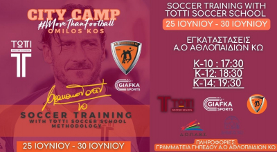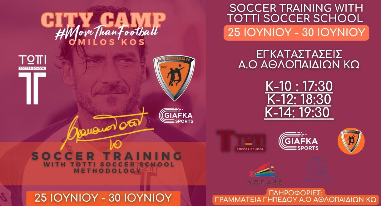 Ξεκινάει το Σάββατο 25 Ιουνίου μέχρι και θα διαρκέσει μέχρι τις 30 Ιουνίου με καθημερινές προπονήσεις στο Soccer Training with Totti Soccer School που διοργανώνει το Giafkasports.gr μαζί με τον Α.Ο Αθλοπαιδιών Κω και τον Γιάννη Μανούσογλου.