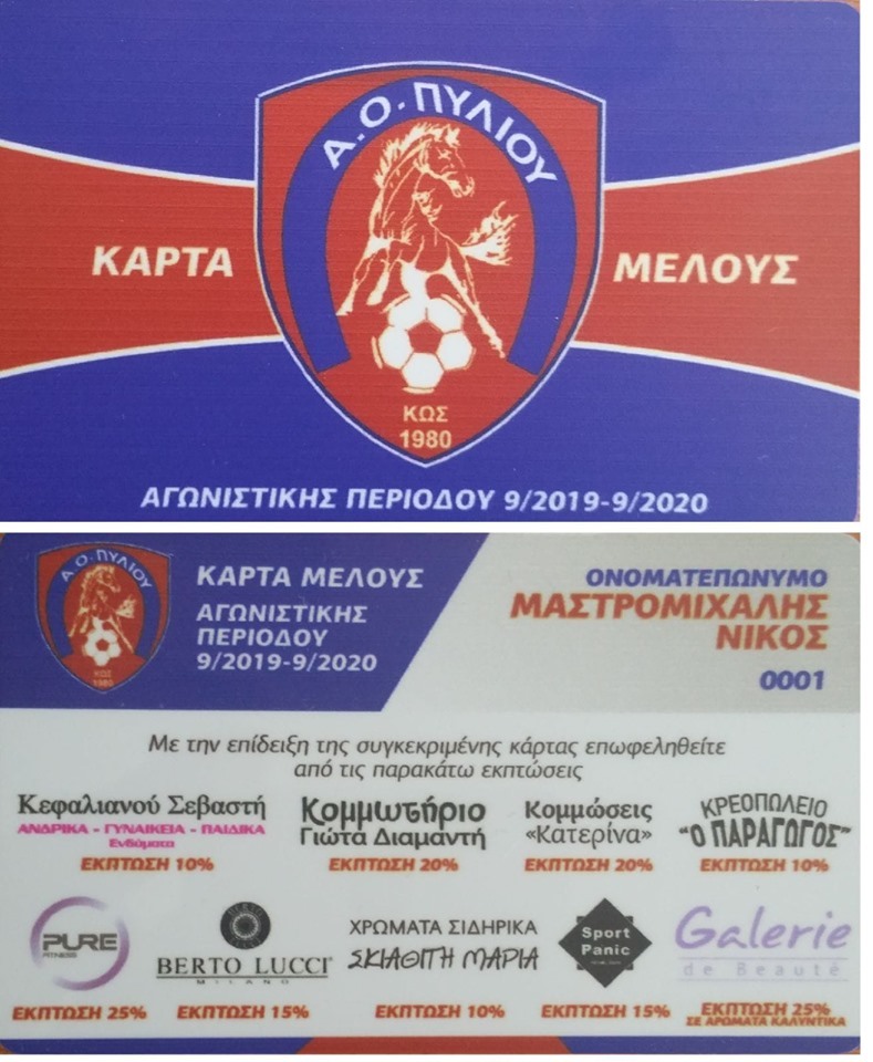 Ανακοίνωσε με την οποία γνωστοποιεί ότι κυκλοφόρησε η κάρτα μέλους που παρέχει εκπτώσεις σε αρκετές επιχειρήσεις εξέδωσε η ομάδα του Α.Ο Πυλίου.