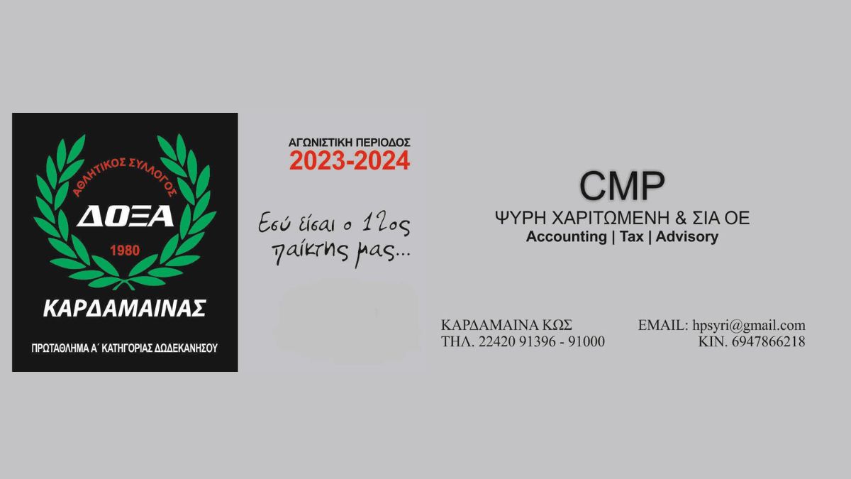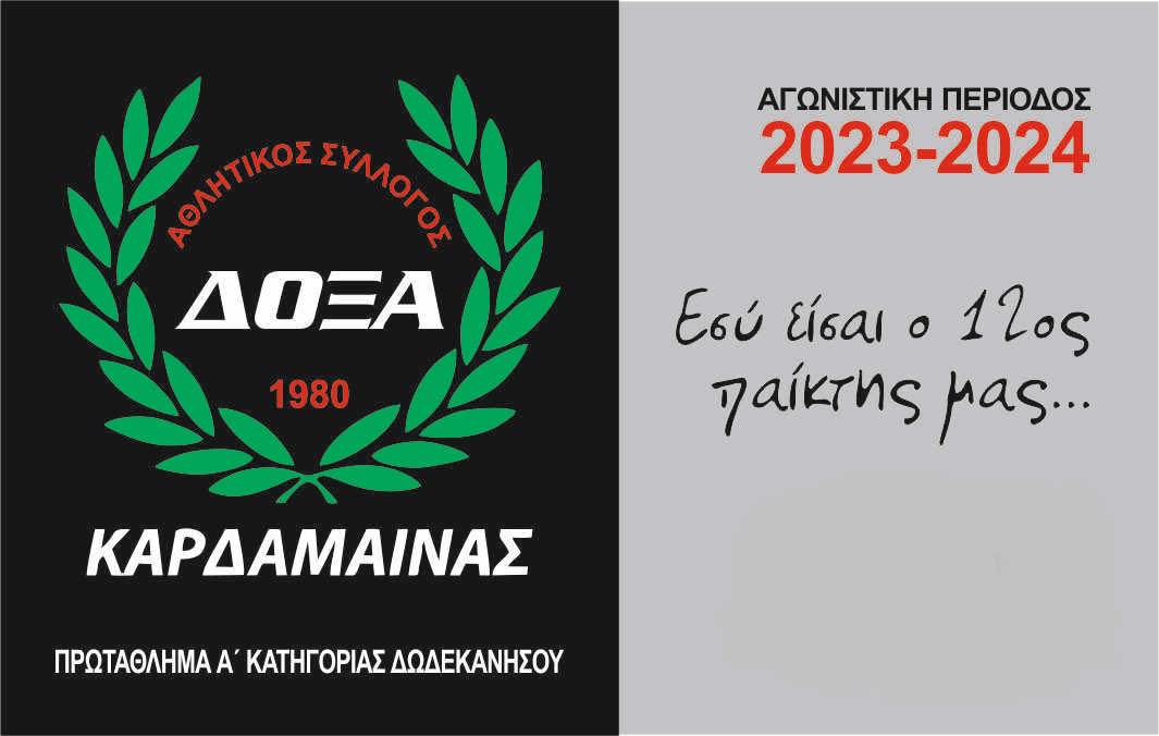 «Ο Α.Σ Δόξα Καρδάμαινας θα ήθελε να ενημερώσει το φίλαθλο κοινό για τις κάρτες διαρκείας που ήδη έχουν κυκλοφορήσει και όσοι επιθυμούν μπορούν να τις προμηθευτούν απ’ τα μέλη του Δ.Σ. Παράλληλα θέλουμε να ευχαριστήσουμε και δημόσια της εταιρεία «CMP – Ψύρη Χαριτωμένη & ΣΙΑ Ο.Ε» για την χορηγία τους και την στήριξη προς το σωματείο μας».