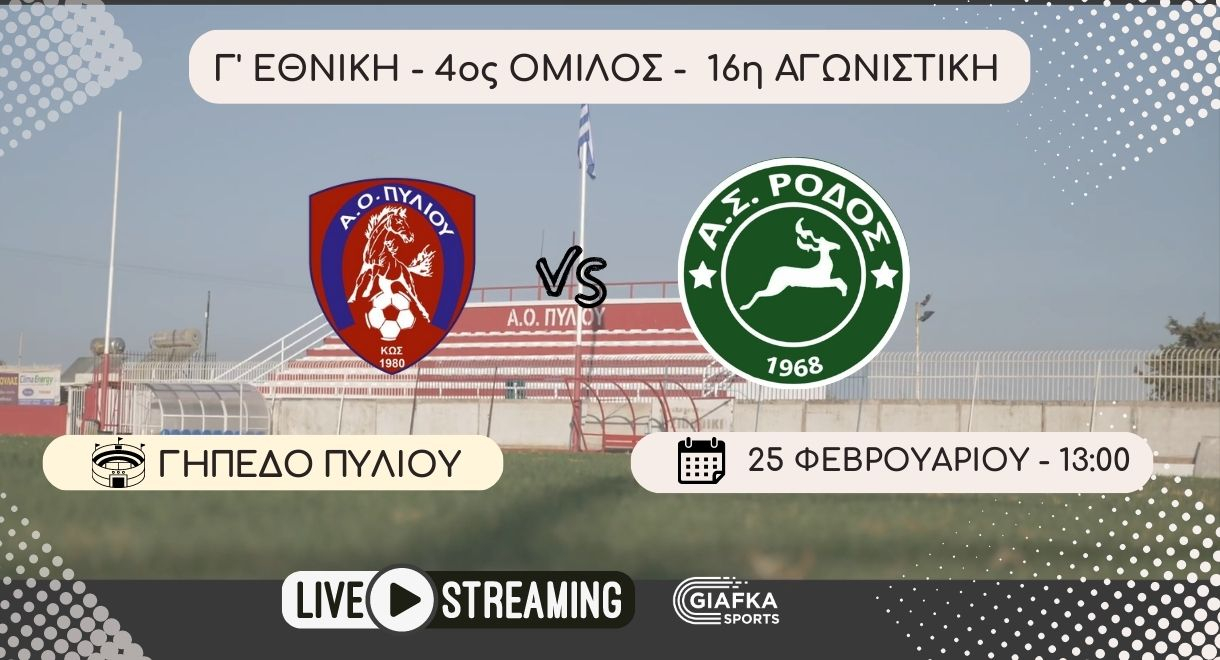 Για την 16η αγωνιστική της Γ’ Εθνικής (4ος Όμιλος), ο Α.Ο Πυλίου υποδέχεται την Ρόδο το Σάββατο 25 Φεβρουαρίου στις 13:00 στο γήπεδο Πυλίου. Παρακολουθήστε το ματς σε Live Streaming απ’ το giafkasports.gr