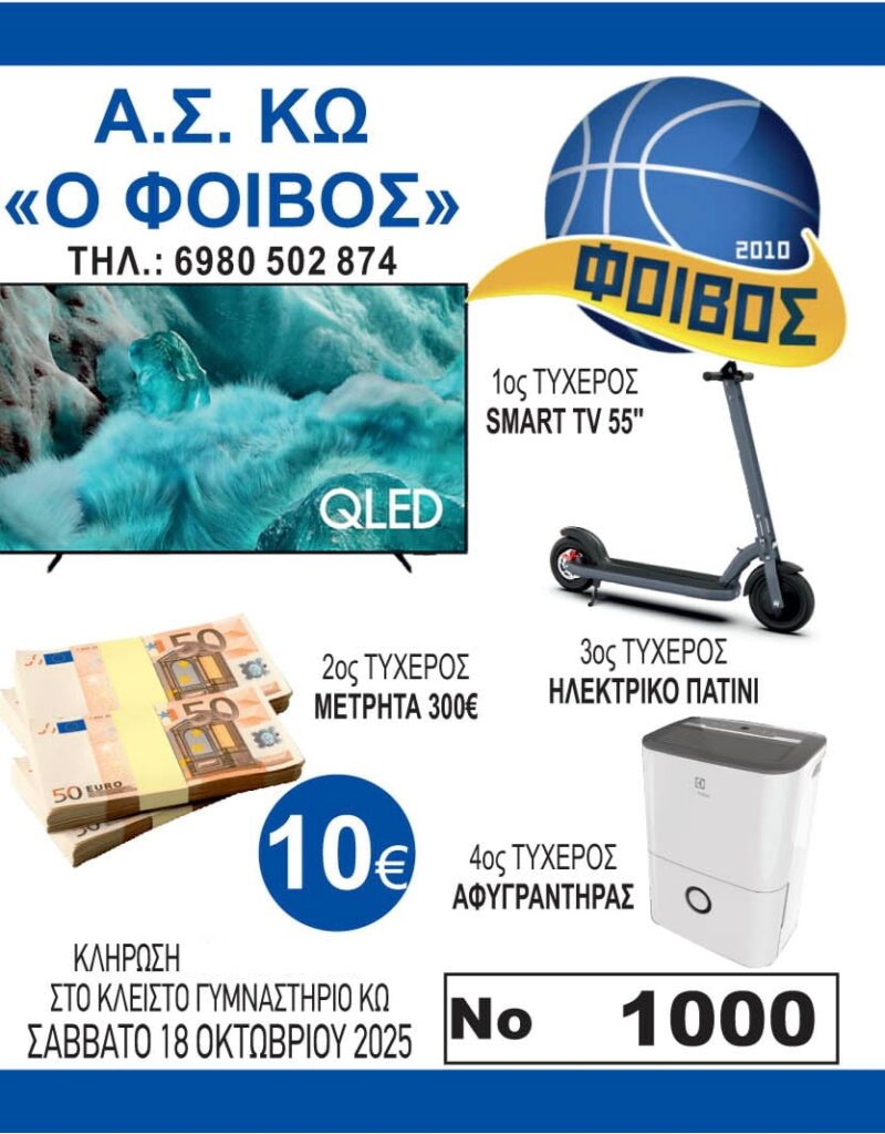 O Φοίβος Κω κάνει τη δική του λαχειοφόρο αγορά για την οικονομική ενίσχυση του. Η κλήρωση θα γίνει στις 18 Οκτωβρίου και η ομάδα ανακοίνωσε τα εξής: ”Αγαπητοί φίλοι, σας ενημερώνουμε ότι ο σύλλογος μας διοργανώνει λαχειοφόρο αγορά προς ενίσχυση του ταμείου του και εκπλήρωση των σκοπών του. Η πώληση των λαχνών θα ξεκινήσει τη Δευτέρα 29 Σεπ 2025 και η κλήρωση θα πραγματοποιηθεί το Σάββατο 18 Οκτ 2025. Τα δώρα που θα κληρωθούν είναι τα παρακάτω: