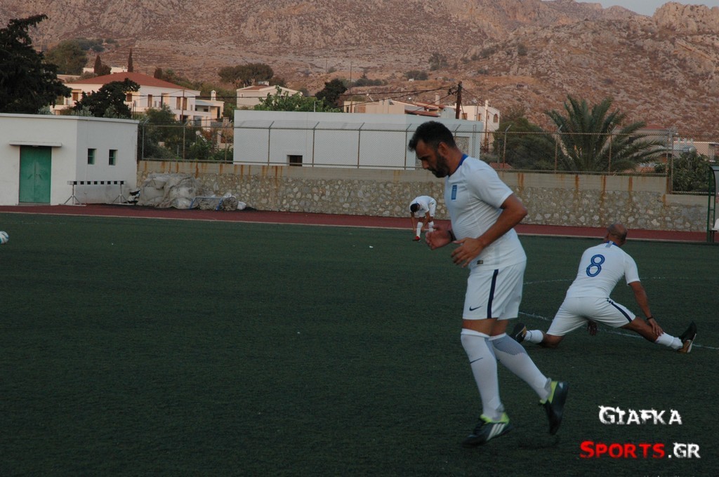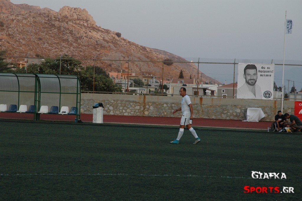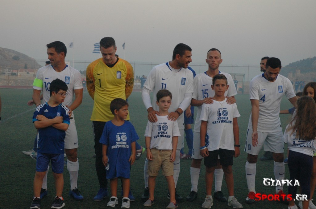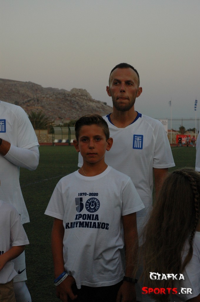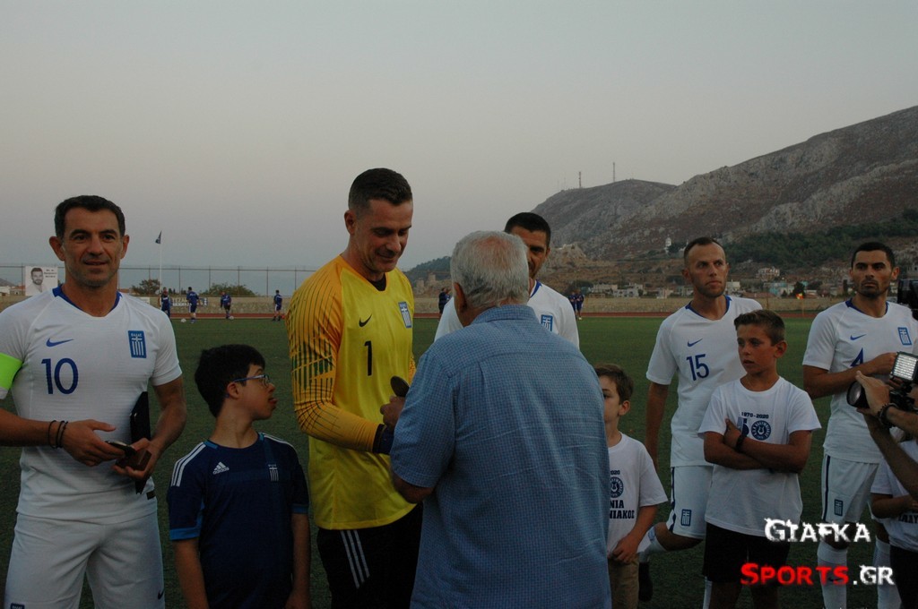 Πριν την έναρξη της αναμέτρησης ο Δήμαρχος Καλύμνου τίμησε τους αστέρες της Εθνικής παραδίδοντας τιμητική πλακέτα στον Γιώργο Καραγκούνη όπως και τον Καλυμνιακό γι’ αυτήν την όμορφη προσπάθεια.