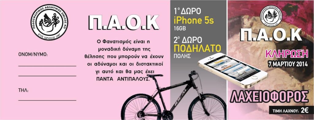 O Ποδοσφαιρικός Αθλητικός Όμιλος Κω με συνεχή παρουσία τα τελευταία 26 χρόνια στα αθλητικά δρώμενα του νησιού μας με 150 ενεργούς αθλητές σε 7 τμήματα (pro junior, junior, Προπαιδικο, Παιδικό, Εφηβικό, Ανδρικό, Βετεράνοι) ζητάει την στήριξη σας για να συνεχίσει να αναπτύσσεται. Μάλιστα ο Π.Α.Ο.Κ. Κω διοργανώνει και λαχειοφόρο αγορά στις 7 Μαρτίου με δώρο ένα iphone 5s και ένα ποδήλατο πόλης. Η τιμή για κάθε λαχνό κοστίζει 5 ευρώ.