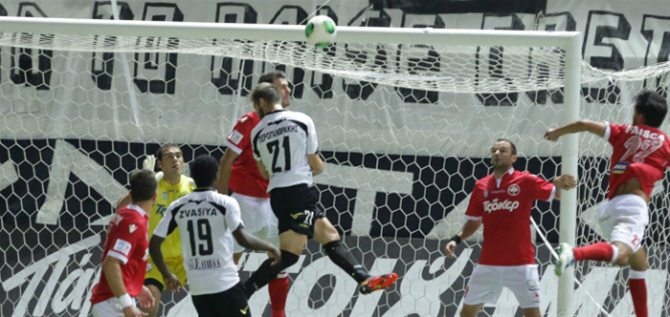 Στο πρώτο μέρος, η εικόνα του αγώνα ήταν κακή, με τη μιοναδική αξιοσημείωτη ευκαιρία να σημειώνεται στο 9′, σε κεφαλιά του Περογαμβράκη, που δε βρήκε στόχο.