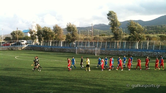 Οι «κόκκινοι» ξεκίνησαν ιδανικά το παιχνίδι αφού μόλις στο 9ο λεπτό ο Οικονόμου έκλεψε την μπάλα απ’ τον Σιώμο και κατάφερε με διαγώνιο σουτ να ανοίξει το σκορ ενώ παρόλο που ο Α.Ο Δικαίου ανέβασε τον ρυθμό του και πίεσε για την ισοφάριση, στο 35ο λεπτό ο Τσατσακλάς εκμεταλλεύτηκε νέο λάθος των αμυντικών και με ψύχραιμο πλασέ έκανε το 0-2 που ήταν και το αποτέλεσμα του πρώτου ημιχρόνου.