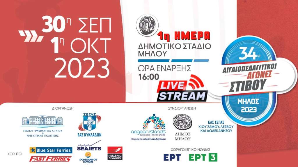 Παρακολουθήστε σε ζωντανή μετάδοση σε παραγωγή του sportcyclades.gr από το Δημοτικό Στάδιο Μήλου τους αγώνες της πρώτης ημέρας των 34ων Αιγαιοπελαγίτικων Αγώνων Στίβου.