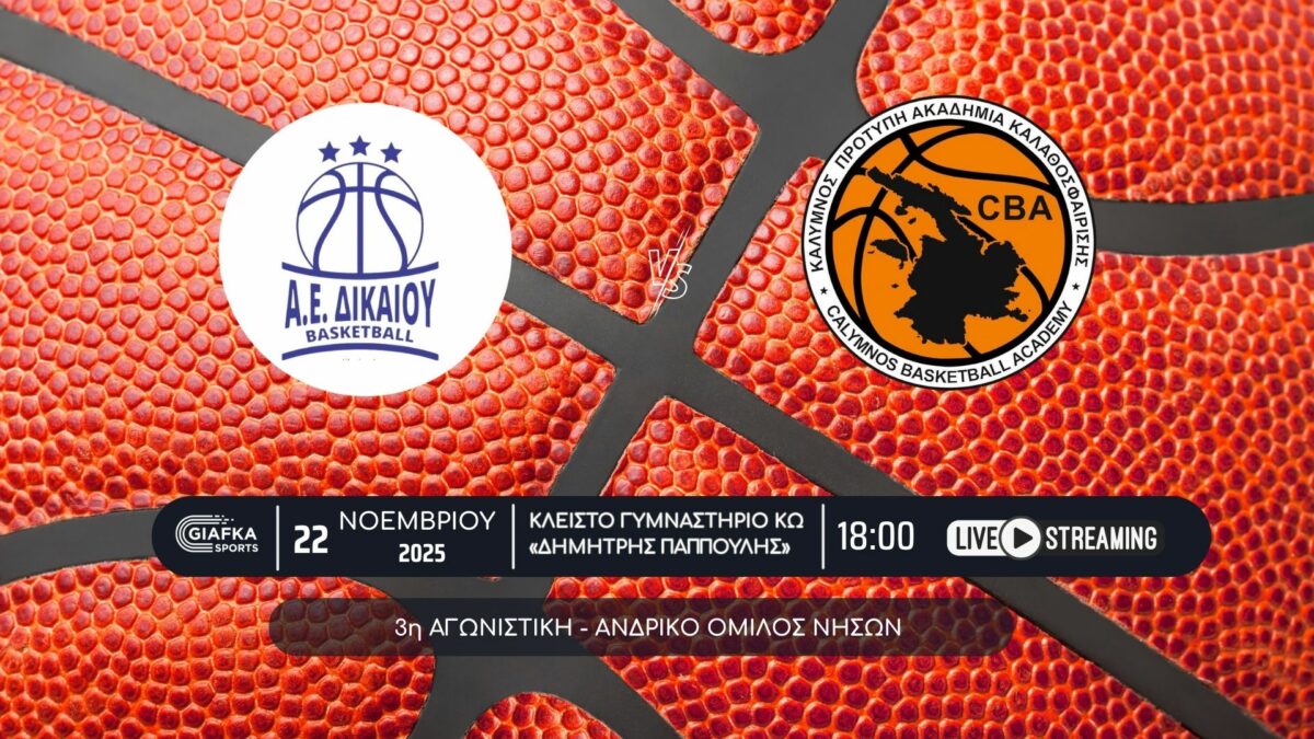 Για την 3η αγωνιστική του Ομίλου νήσων η Α.Ε Δικαίου αντιμετωπίζει την Ακαδημία Καλύμνου το Σάββατο στις 18:00 στο Κλειστό γυμναστήριο Κω «Δημήτρης Παππούλης». Παρακολουθήστε το ματς σε Live Streaming απ’ το giafkasports.gr