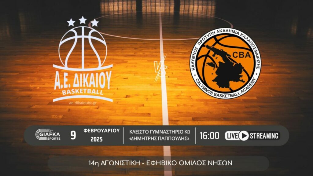 Για την 14η αγωνιστική του εφηβικού πρωταθλήματος του Ομίλου νήσων η Α.Ε Δικαίου υποδέχεται στις 16:00 στο Κλειστό γυμναστήριο Κω «Δημήτρης Παππούλης» την Ακαδημία Καλύμνου. Παρακολουθήστε το ματς σε Live Streaming απ’ το giafkasports.gr