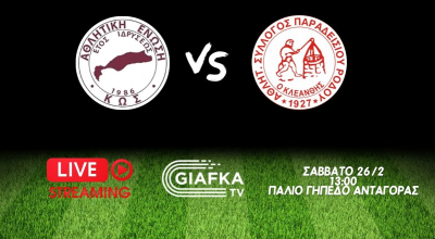 Δείτε το Σάββατο 26/2 σε Live Streaming απ’ το giafkasports.gr,  στις 13:00 το μεγάλο ντέρμπι παραμονής στην Α’ κατηγορία Δωδεκανήσου ανάμεσα σε Α.Ε Κω και Κλεάνθη Παραδεισίου για την 16η αγωνιστική.