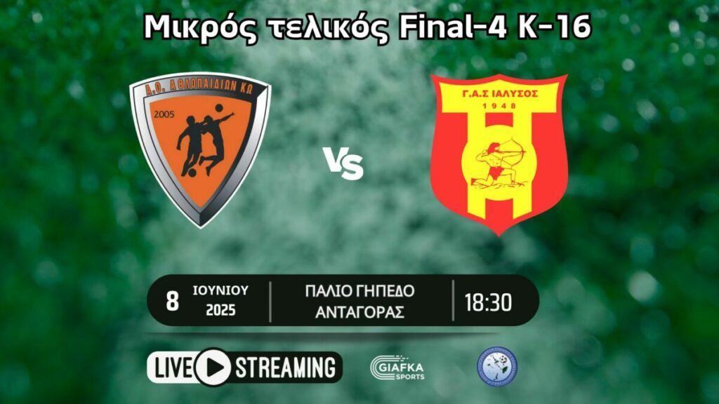 Παρακολουθήστε στις 18:30 τον μικρό τελικό της κατηγορίας Κ-16 ανάμεσα σε Α.Ο Αθλοπαιδιών Κω και Ιάλυσο σε Live Streaming απ’ το giafkasports.gr