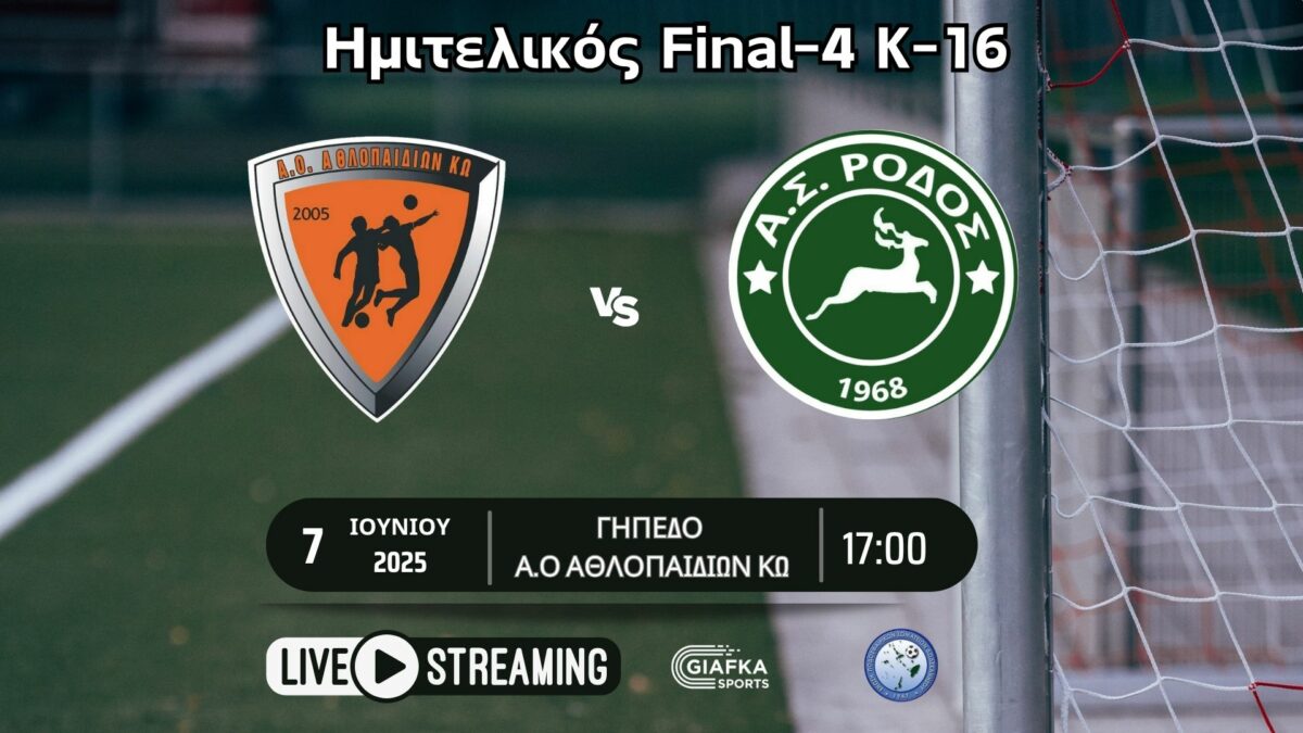 Για τον ημιτελικό της κατηγορίας Κ-16 ο Α.Ο Αθλοπαιδιών Κω αντιμετωπίζει στο γήπεδο του την Ρόδο στις 17:00. Παρακολουθήστε το ματς σε Live Streaming απ’ το giafkasports.gr