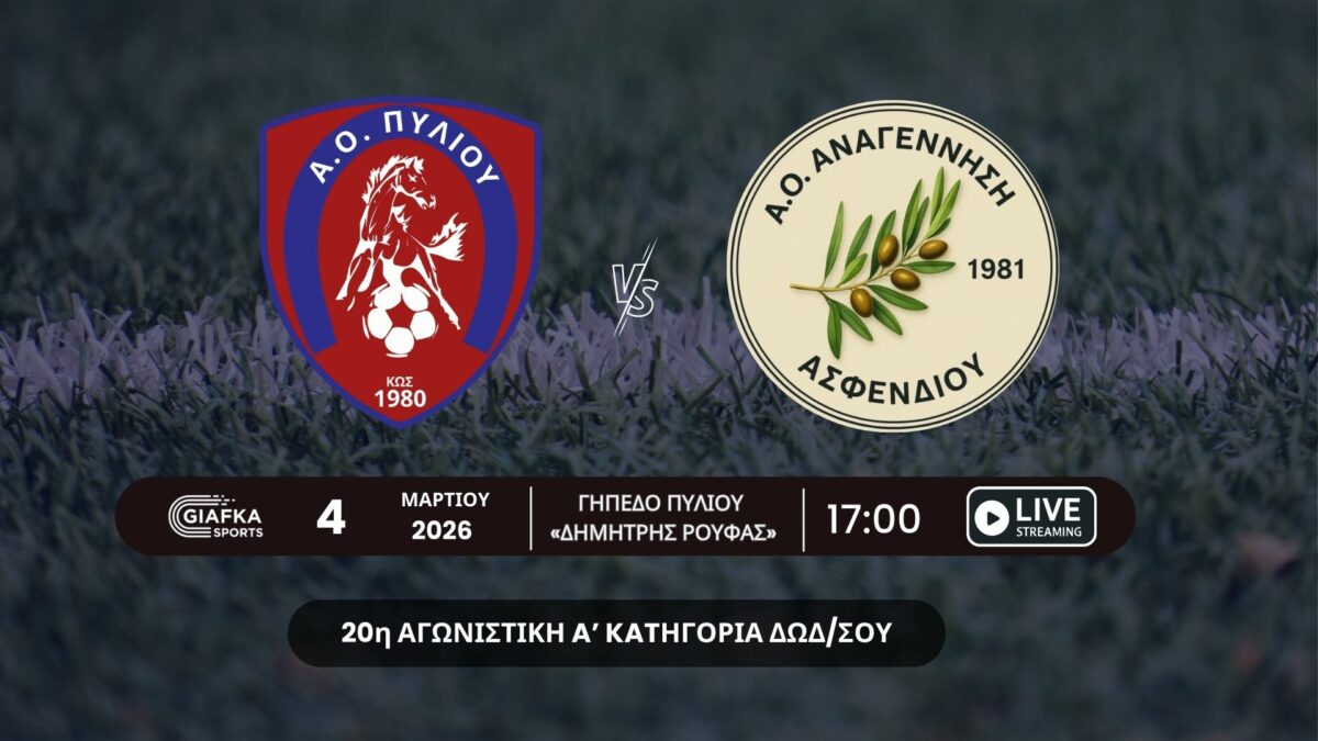 Για την 20η αγωνιστική της Α’ κατηγορίας ο Α.Ο Πυλίου υποδέχεται σήμερα στις 17:00 στο Δημοτικό γήπεδο Πυλίου «Δημήτρης Ρούφας» την Αναγέννηση Ασφενδιού. Δείτε το ματς σε Live Streaming μέσα απ’ το giafkasports.gr