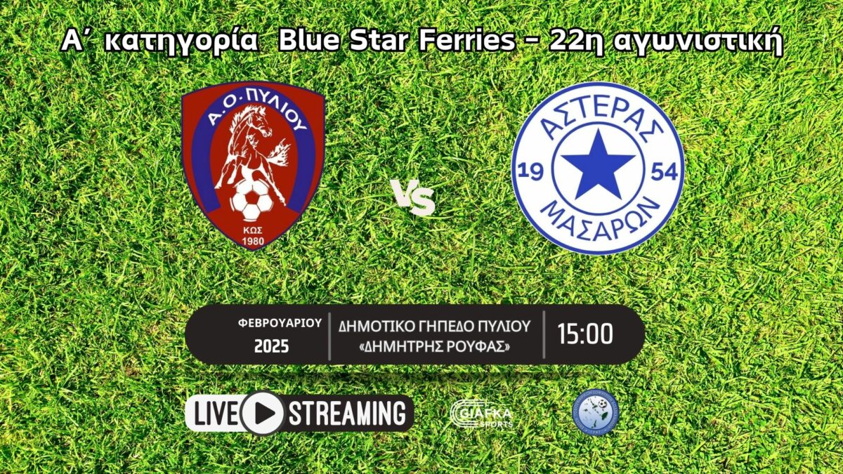 Για την 22η αγωνιστική της Α’ κατηγορίας ο Α.Ο Πυλίου υποδέχεται την Κυριακή στις 15:00 το ντέρμπι ανάμεσα σε Α.Ο Πυλίου και Αστέρα Μασάρων. Δείτε το ματς σε live streaming απ’ το giafkasports.gr