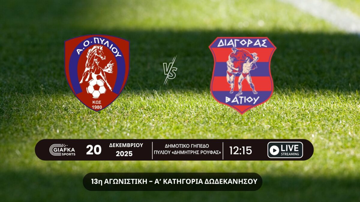Για την 13η αγωνιστική της Α’ κατηγορίας Δωδεκανήσου ο Α.Ο Πυλίου υποδέχεται το Σάββατο στις 12:15 τον Διαγόρα Βατίου στο Δημοτικό γήπεδο Πυλίου «Δημήτρης Ρούφας». Παρακολουθήστε το ματς σε Live Streaming απ’ το giafkasports.gr