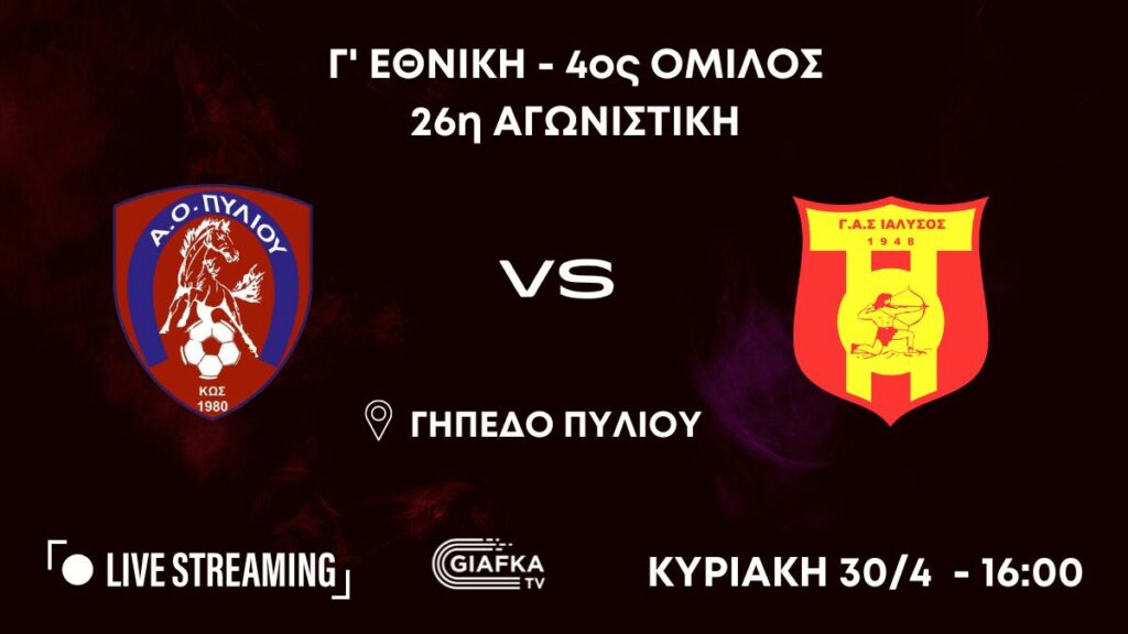 Παρακολουθήστε σε Live Streaming στις 30/4 απ’ το giafkasports.gr το ματς της 26ης αγωνιστικής της Γ΄ Εθνικής ανάμεσα σε Α.Ο Πυλίου και Ιάλυσο στις 16:00.