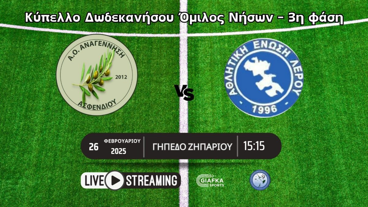 Για την πρόκριση στους «8» του κυπέλλου Δωδεκανήσου μάχονται Αναγέννηση Ασφενδιού και Α.Ε Λέρου στις 15:15 στο γήπεδο Ζηπαρίου. Παρακολουθήστε το ματς σε Live Streaming απ’ το giafkasports.gr
