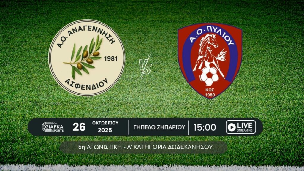 Παρακολουθήστε την αναμέτρηση για την 5η αγωνιστική της Α’ Κατηγορίας Δωδεκανήσου μεταξύ της Αναγέννησης Ασφενδιού και του Α.Ο. Πυλίου, ζωντανά μέσα από το giafkasports.