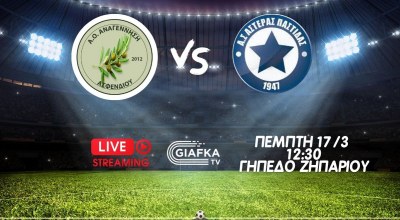 Δείτε σε Live Streaming την Πέμπτη 17/3 στις 12:30 την εξ αναβολής αναμέτρηση για την 17η αγωνιστική της Α’ κατηγορίας ανάμεσα σε Αστέρα Παστίδας και Αναγέννηση Ασφενδιου.
