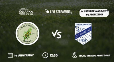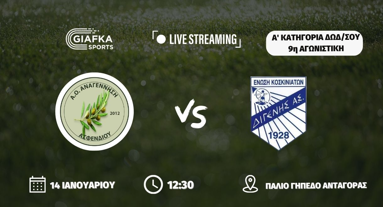 Για την 9η αγωνιστική της Α’ κατηγορίας (Β’ Όμιλος) η Αναγέννηση Ασφενδιού υποδέχεται στις 12:30 στο παλιό γήπεδο Ανταγόρας, τον Διγενή Κοσκινού (14/1 – 15:00). Παρακολουθήστε το ματς σε Live Streaming απ’ το giafkasports.gr