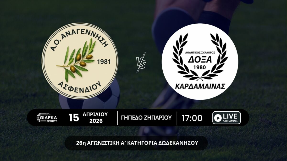 Για την 26η αγωνιστική της Α’ κατηγορίας η Αναγέννηση Ασφενδιού υποδέχεται την Τετάρτη 15/4 στις 17:00 την Δόξα Καρδάμαινας στο γήπεδο Ζηπαρίου. Παρακολουθήστε το ματς σε Live Streaming απ’ το giafkasports.gr