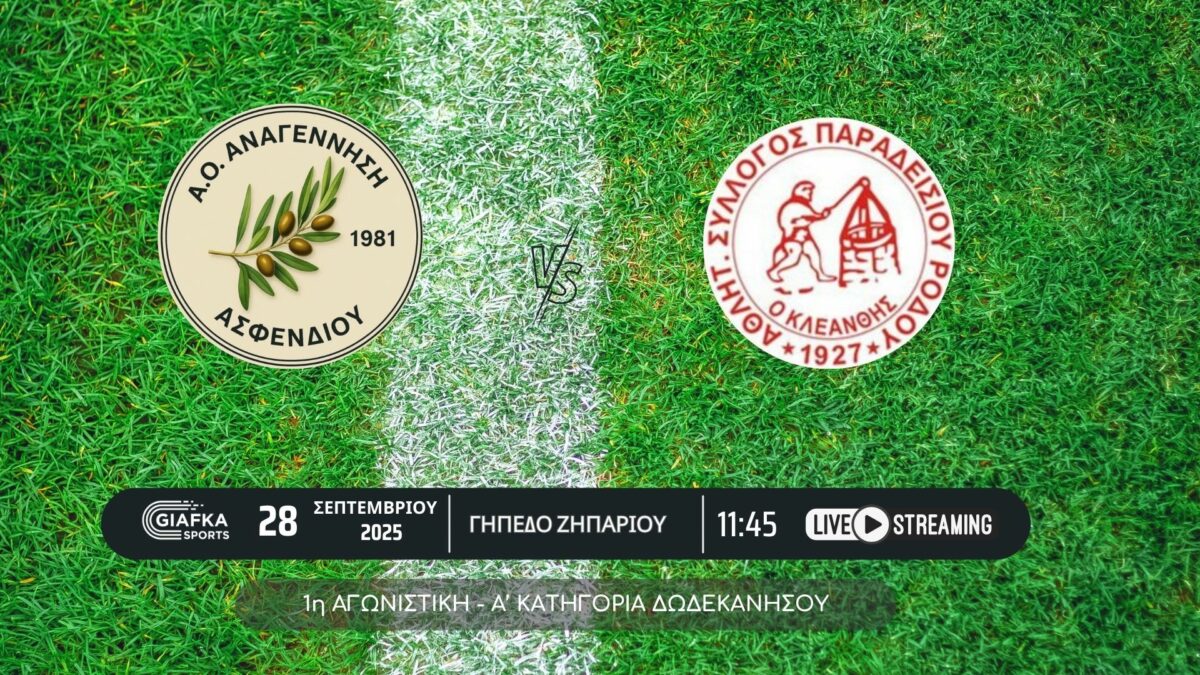 Για την 1η αγωνιστική της Α’ κατηγορίας Δωδεκανήσου η Αναγέννηση Ασφενδιού υποδέχεται την Κυριακή στις 11:45 τον Κλεάνθη Παραδεισίου στο γήπεδο Ζηπαρίου. Παρακολουθήστε το ματς σε live streaming απ’ το giafkasports.gr