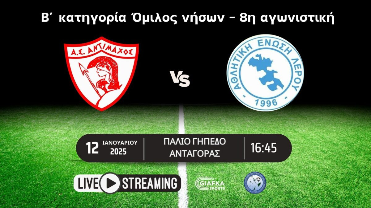 Για την 8η αγωνιστική της Β’ κατηγορίας του Ομίλου νήσων ο Αντίμαχος υποδέχεται την Κυριακή στις 16:45 την Α.Ε Λέρου στο παλιό γήπεδο Ανταγόρας. Παρακολουθήστε το ματς σε Live Streaming απ’ το giafkasports.gr