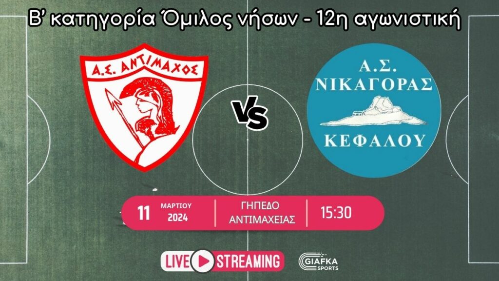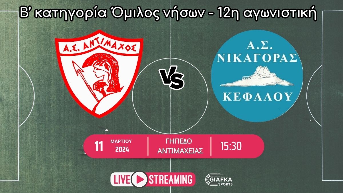 Για την 12η αγωνιστική της Β’ κατηγορίας του Ομίλου νήσων ο Αντίμαχος υποδέχεται στο γήπεδο του το Νικαγόρα την Δευτέρα 11/3 στις 15:30. Παρακολουθήστε το ματς σε Live Streaming απ’ το giafkasports.gr