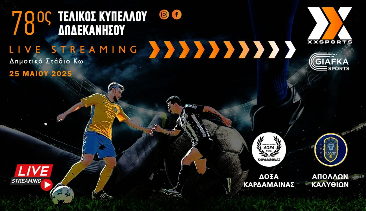 Παρακολουθήστε στις 17:30 απ’ το παλιό γήπεδο Ανταγόρας σε κοινή παραγωγή του xxsports και του giafkasports τον μεγάλο τελικό του κυπέλλου Δωδεκανήσου. Απόλλων Καλυθιών και Δόξα Καρδάμαινας μάχονται για το τρόπαιο στην Κω.
