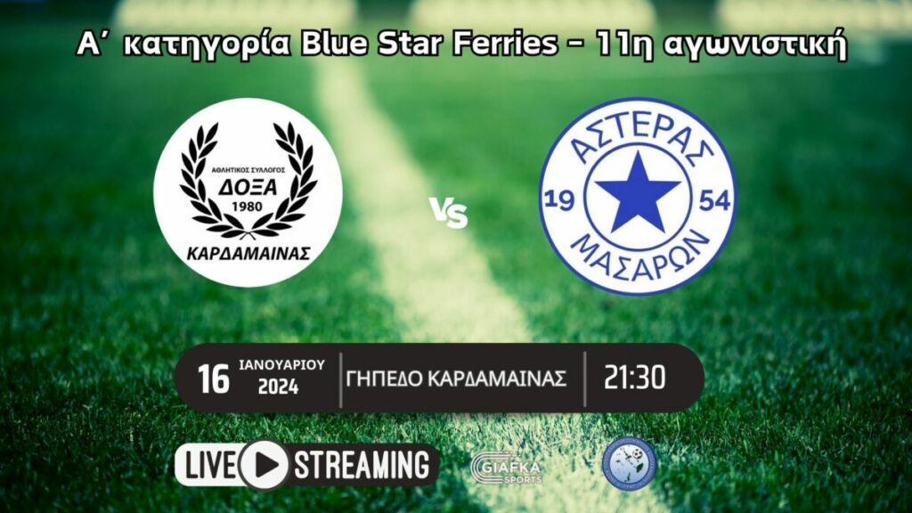 Για την εξ αναβολής αναμέτρηση της 11ης αγωνιστικής της Α’ κατηγορίας η Δόξα Καρδάμαινας υποδέχεται την Πέμπτη 16/1 στις 21:30 τον Αστέρα Μασάρων. Παρακολουθήστε το ματς σε Live Streaming απ’ το giafkasports.gr