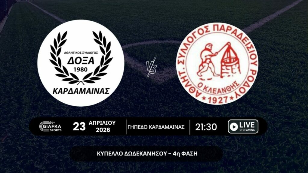 Home » Live Streaming: Δόξα Καρδάμαινας – Κλεάνθης Παραδεισίου | 4η φάση κυπέλλου Δωδεκανήσου