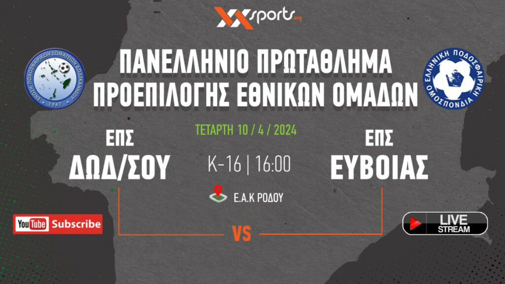 Παρακολουθήστε στις 16:00 σε Live Streaming το ματς της Κ-16 της ΕΠΣ Δωδεκανήσου κόντρα στην ΕΠΣ Εύβοιας για τους «16» του Πανελληνίου πρωταθλήματος προεπιλογές εθνικών ομάδων.