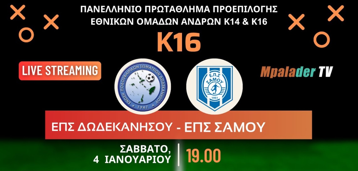 Παρακολουθήστε σε Live Streaming σε παραγωγή του Mpalader TV τον αγώνα της πρεμιέρας της μικτής Δωδεκανήσου Κ-16 κόντρα στην ΕΠΣ Σάμου στο πλαίσιο του πρωταθλήματος προεπιλογής εθνικών ομάδων.