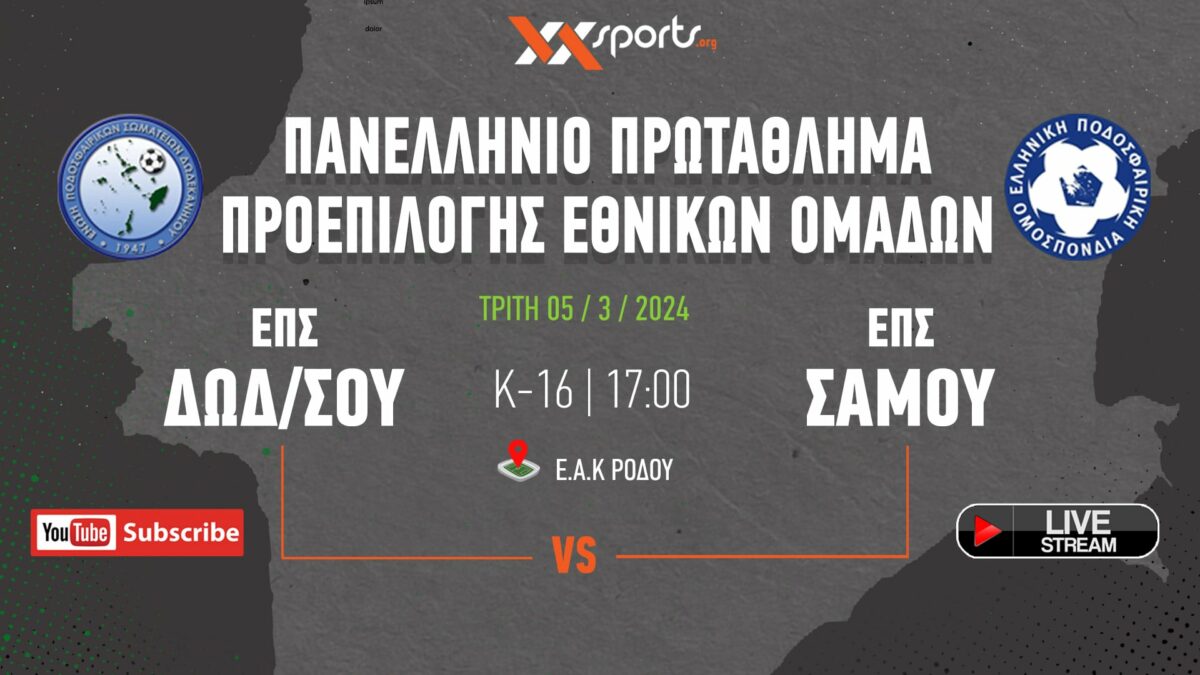 Παρακολουθήστε στις 17:00 σε παραγωγή απ’ το xxsports.org το ματς της ΕΠΣ Δωδεκανήσου απέναντι στην ΕΠΣ Σάμου.
