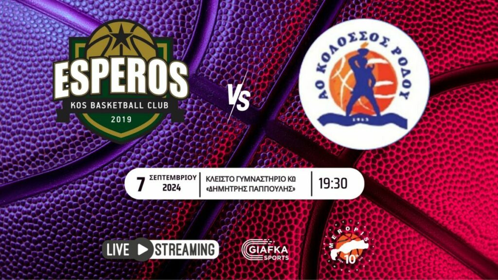 Για το 10ο «Kipriotis Hotels Meropis International Basketball Tournamen ο Έσπερος αντιμετωπίζει το Σάββατο 7/9 στις 19:30 τον Κολοσσό για αγώνα κατάταξης για τις θέσεις 5-6. Παρακολουθήστε το ματς σε Live Streaming απ’ το giafkasports.gr