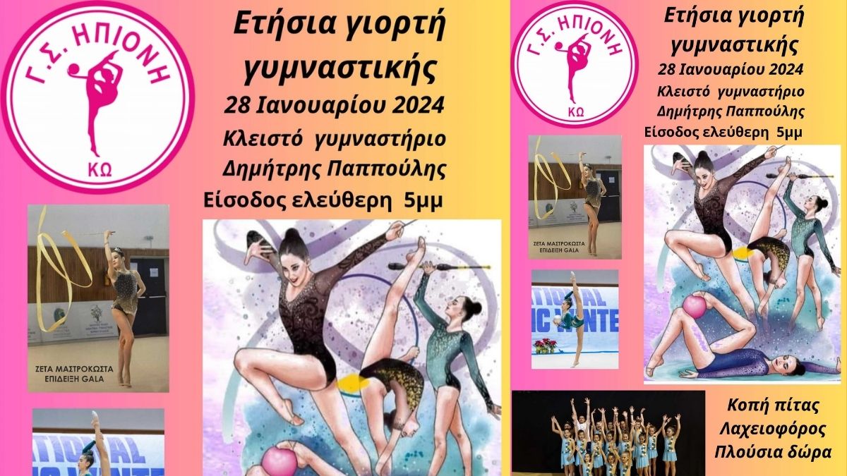 Την Κυριακή 28 Ιανουαρίου στις 17:00 θα πραγματοποιηθεί η ετήσια γιορτή του Γ.Σ Ηπιόνη όπου θα παρουσιαστούν όλες οι αθλήτριες μας (αγωνιστικών τμημάτων και τμημάτων ανάπτυξης Ακαδημιών) . Κατά τη διάρκεια της εκδήλωσης θα γίνει η κοπή της πίτας του Συλλόγου μας καθώς και βραβεύσεις αθλητριών με κύρια την βράβευση της Πρωταθλήτριας μας στο Πανελλήνιο Σχολικό Πρωτάθλημα Ρυθμικής κατηγορίας Γυναικών 2023. Παρακολουθήστε την εκδήλωση σε Live Streaming απ’ το giafkasports.gr