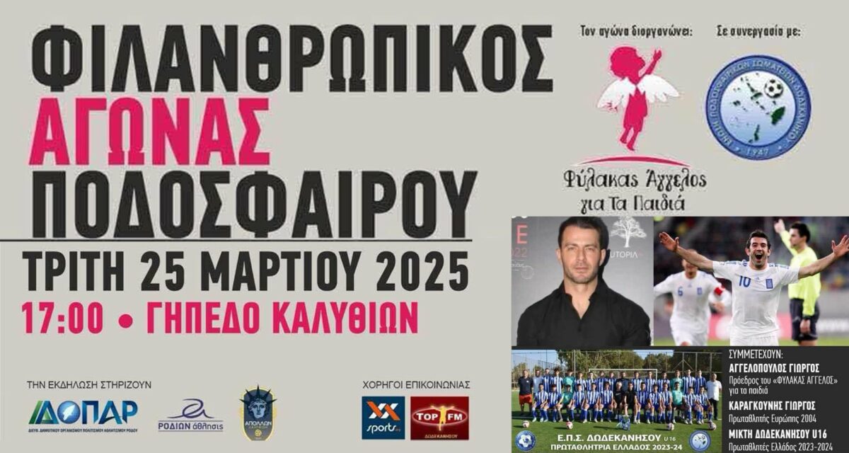 Παρακολουθήστε σε ζωντανή μετάδοση από το γήπεδο Καλυθιών τον φιλανθρωπικό αγώνα ποδοσφαίρου που διοργανώνουν ο «Φύλακας Άγγελος για τα παιδιά» μαζί με την ΕΠΣ Δωδεκανήσου με την συμμετοχή της μικτής ομάδας, του Γιώργου Αγγελόπουλου και του Γιώργου Καραγκούνη.