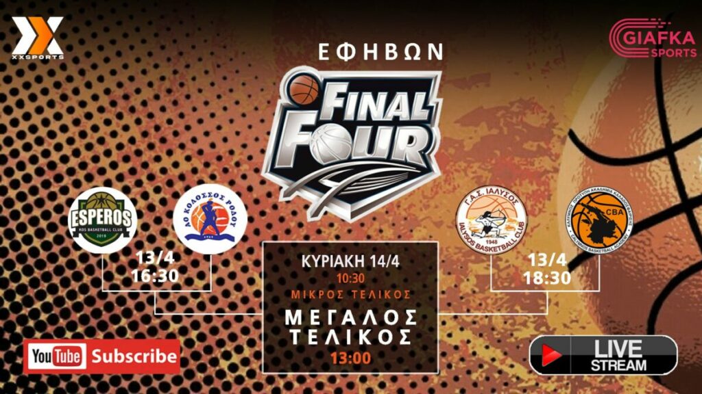 Ο τίτλος του εφηβικού πρωταθλήματος κρίνεται στο κλειστό γυμναστήριο της Σύμης το ερχόμενο Σαββατοκύριακο (13 & 14 Απριλίου). Ιάλυσος, Κολοσσός, Ακαδημία Καλύμνου και Έσπερος Κω διεκδικούν τον φετινό τίτλο σε ζωντανή μετάδοση από xxsports.org και giafkasports.gr.