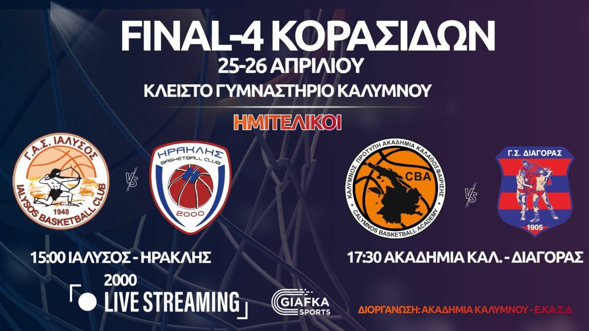 Στην Κάλυμνο διεξάγεται η τελική φάση του πρωταθλήματος κορασίδων με το Final-4 στις 25 και 26 Απριλίου. Παρακολουθήστε σε Live Streaming την διοργάνωση μέσα απ’ το giafkasports.gr