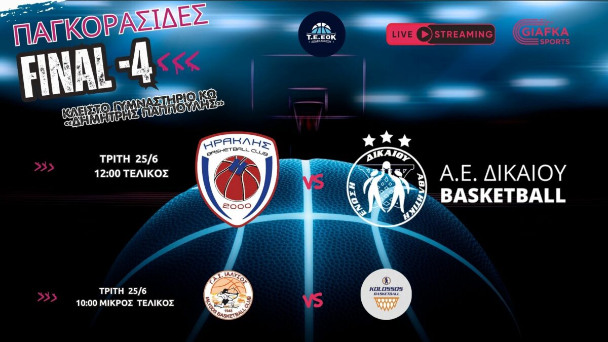 Παρακολουθήστε σε Live Streaming απ’ το giafkasports.gr το Final-4 τον μεγάλο τελικό ανάμεσα σε Ηρακλή 2000 και Δικαίου για το πρωτάθλημα παγκορασίδων. Νωρίτερα θα γίνει ο μικρός τελικός ανάμεσα σε Ιάλυσο και Κολοσσό.