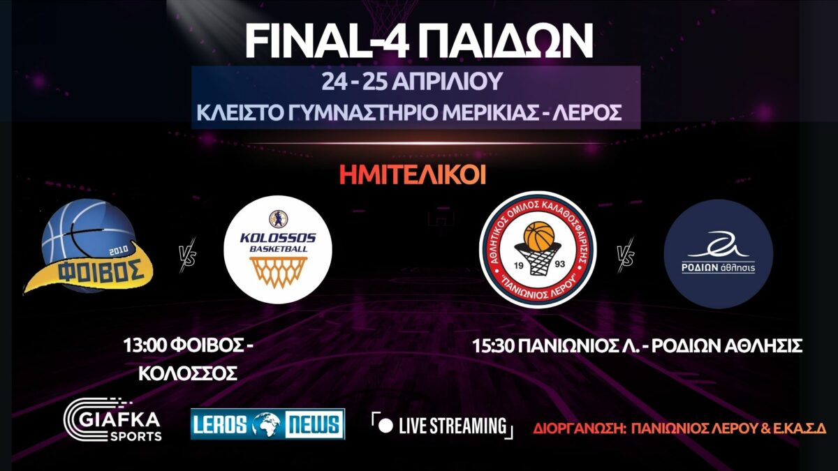 Στην Λέρο χτυπά η καρδιά του Δωδεκανησιακού σε ότι αφορά τους παίδες με το Final-4 να διεξάγεται στο Κλειστό γυμναστήριο της Μερικιάς. Παρακολουθήστε το Final-4 σε Live Streaming μέσα απ’ το giafkasports.gr σε συνεργασία με το lerosnews.gr