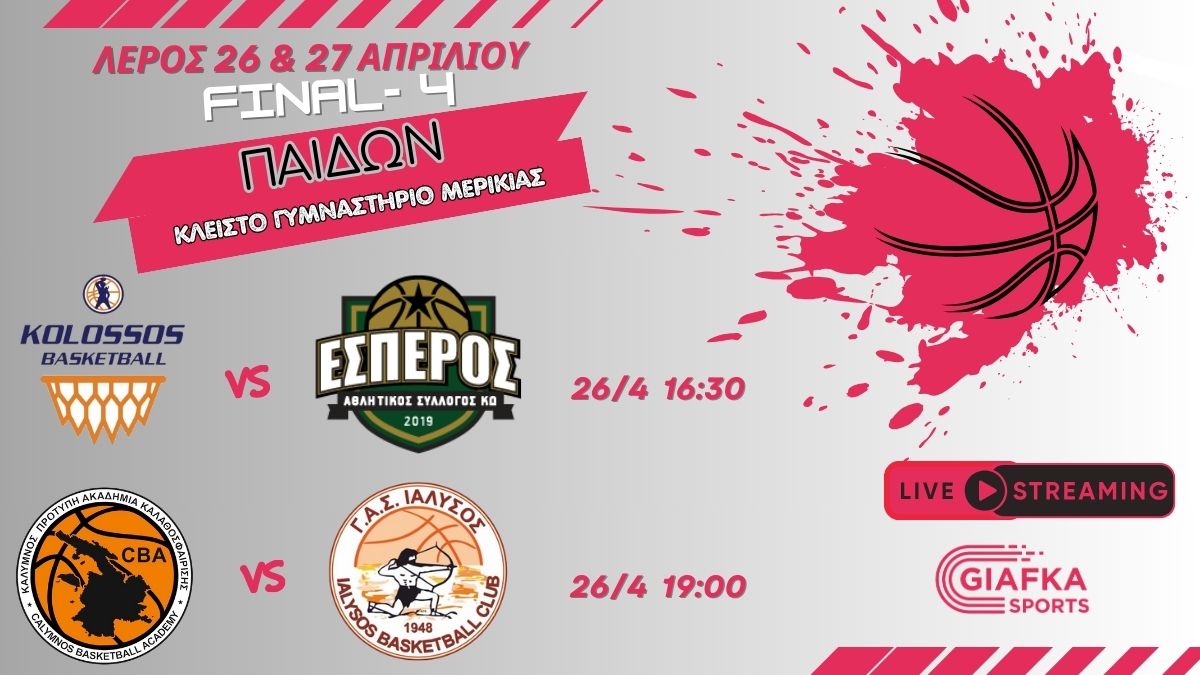 Παρακολουθήστε σε Live Streaming απ’ το giafkasports.gr το Final-4 των παίδων απ’ την Λέρο με την συμμετοχή της Ακαδημίας Καλύμνου, του Ιάλυσου, του Κολοσσού και του Εσπέρου.