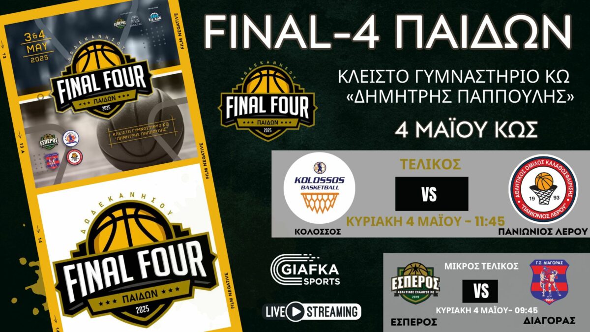 Το Σαββατοκύριακο 3 & 4 Μαΐου θα διεξαχθεί στο Κλειστό γυμναστήριο Κω «Δημήτρης Παππούλης» τo Final-4 των παίδων με διοργανωτή τον Έσπερο. Παρακολουθήστε την διοργάνωση σε Live Streaming μέσα απ’ το giafkasports.gr.