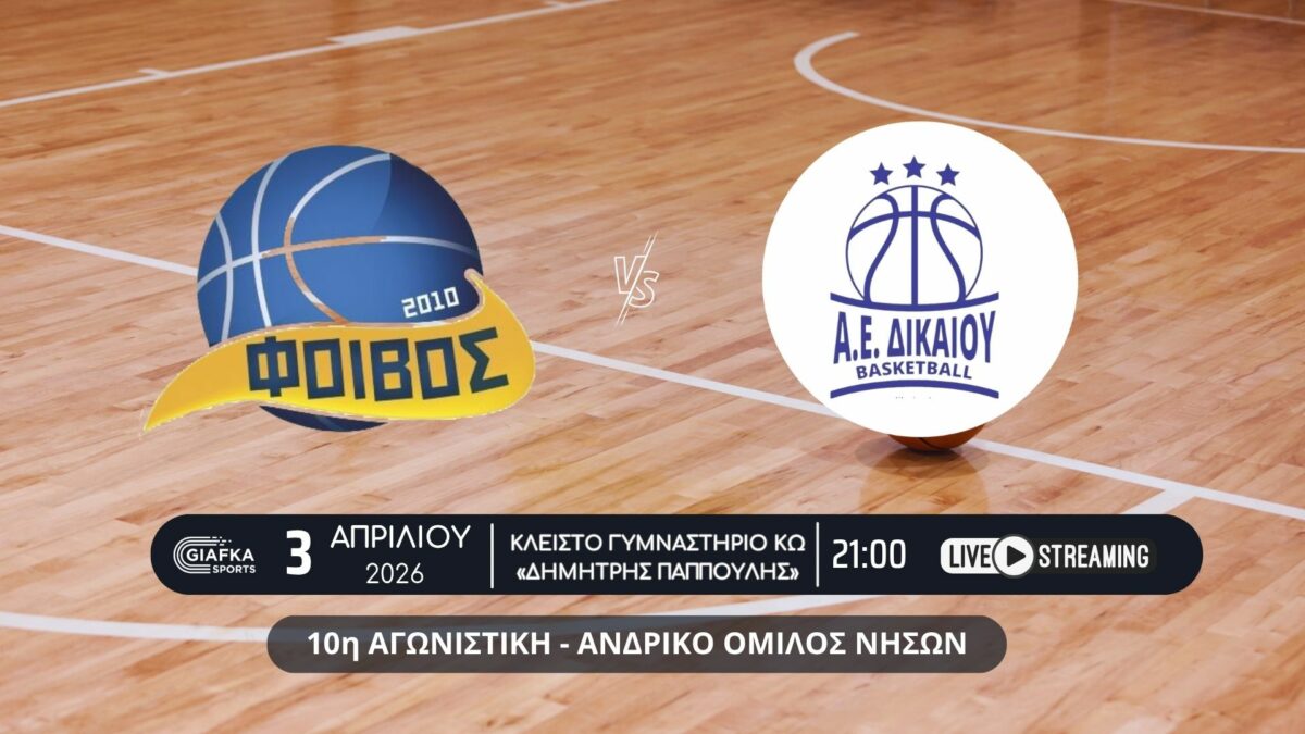 Για την 10η αγωνιστική του ανδρικού πρωταθλήματος στον Όμιλο νήσων ο Φοίβος αντιμετωπίζει στις 21:00 την Α.Ε Δικαίου στο Κλειστό γυμναστήριο Κω «Δημήτρης Παππούλης». Παρακολουθήστε το ματς σε Live Streaming απ’ το giafkasports.gr