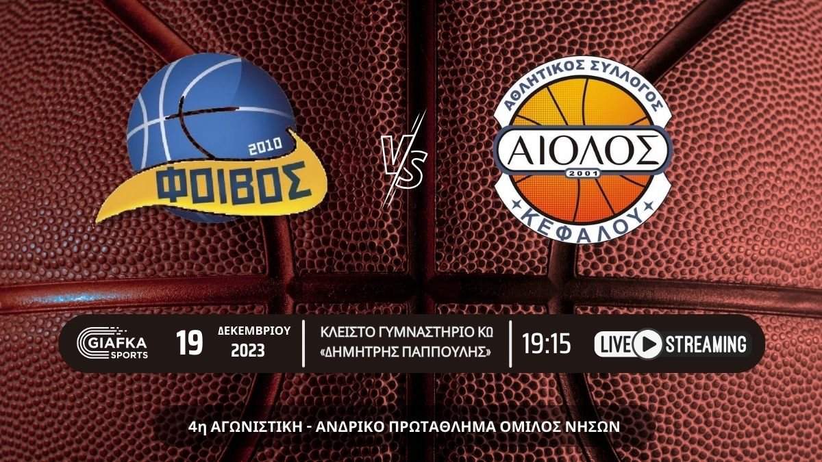 Για την 4η αγωνιστική του Ομίλου νήσων ο Φοίβος υποδέχεται στις 19:15 στο Κλειστό γυμναστήριο Κω «Δημήτρης Παππούλης» τον Αίολο Κεφάλου. Παρακολουθήστε το ματς σε Live Streaming απ’ το giafkasports.gr