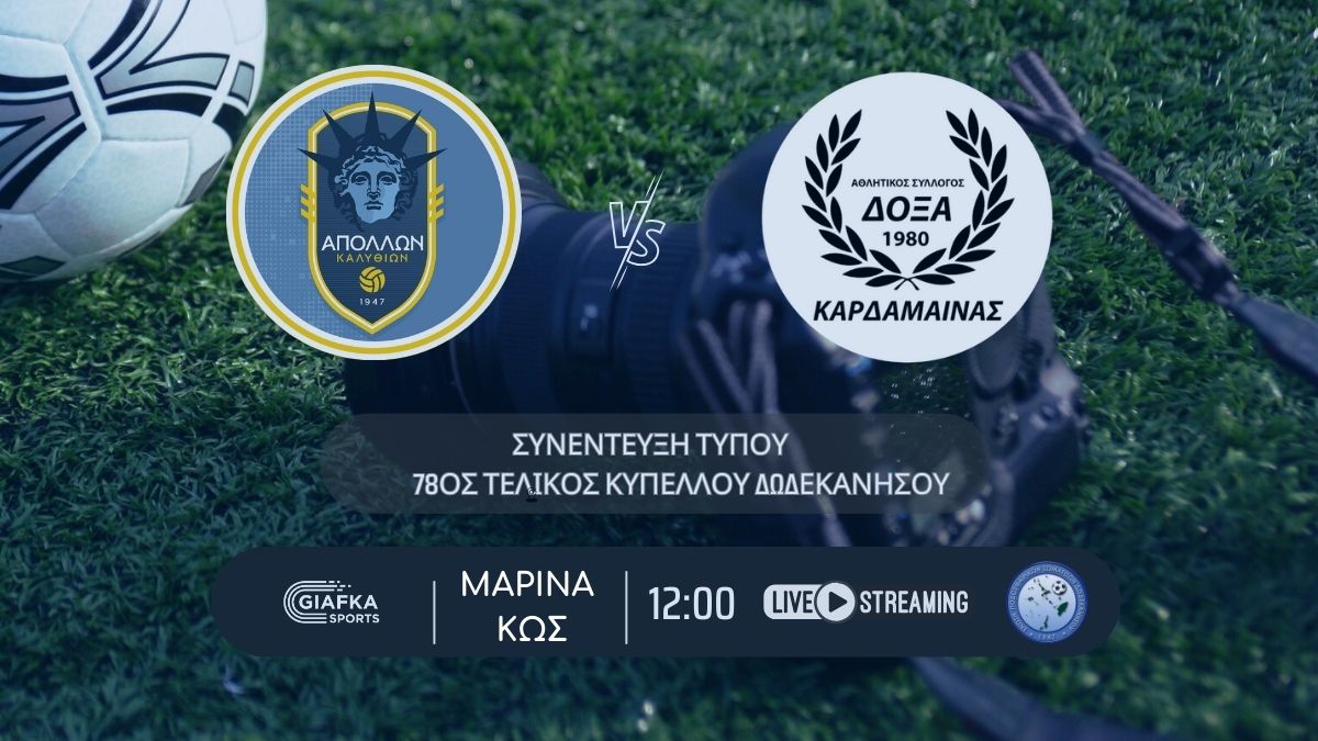 Παρακολουθήστε στις 12:00 απ’ την αίθουσα της Μαρίνας την συνέντευξη τύπου του 78ου τελικού κυπέλλου Δωδεκανήσου ανάμεσα σε Απόλλων Καλυθιών και Δόξα Καρδάμαινας που θα πραγματοποιηθεί την Κυριακή στις 17:30 στο παλιό γήπεδο Ανταγόρα. Οι αρχηγοί, οι εκπρόσωποι των ομάδων και οι προπονητές θα μιλήσουν για τον μεγάλο τελικό.